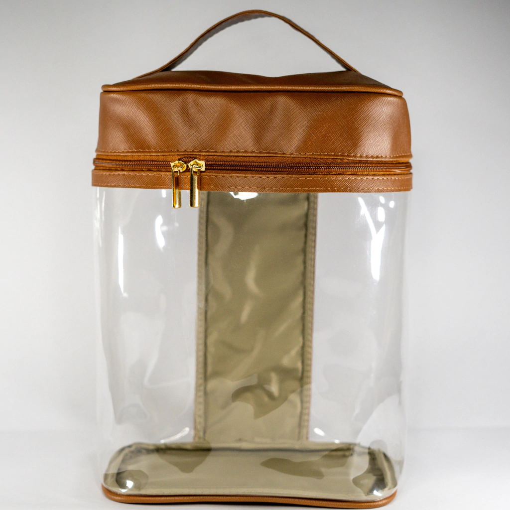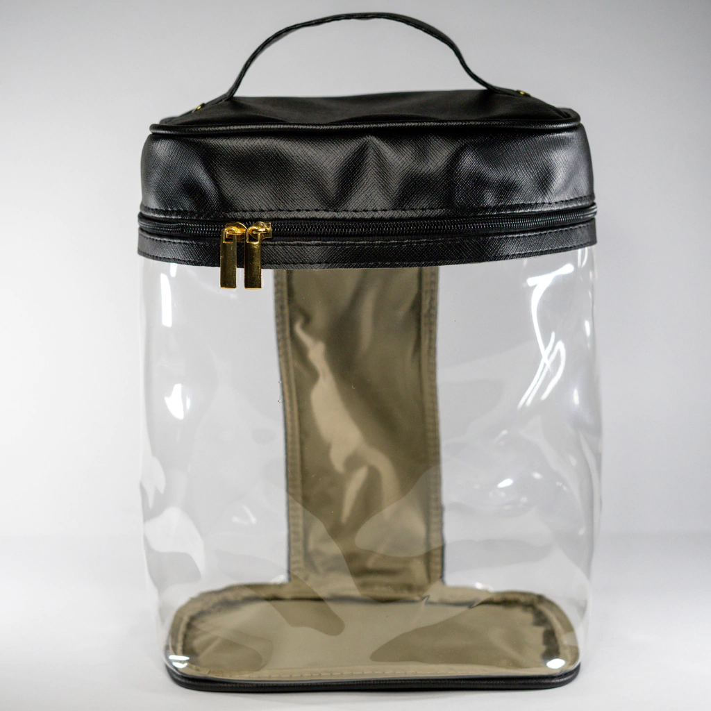 A frasqueira é a escolha ideal para transportar frascos grandes de shampoo, itens maiores como secador de cabelo, e oferece uma facilidade de visualização.